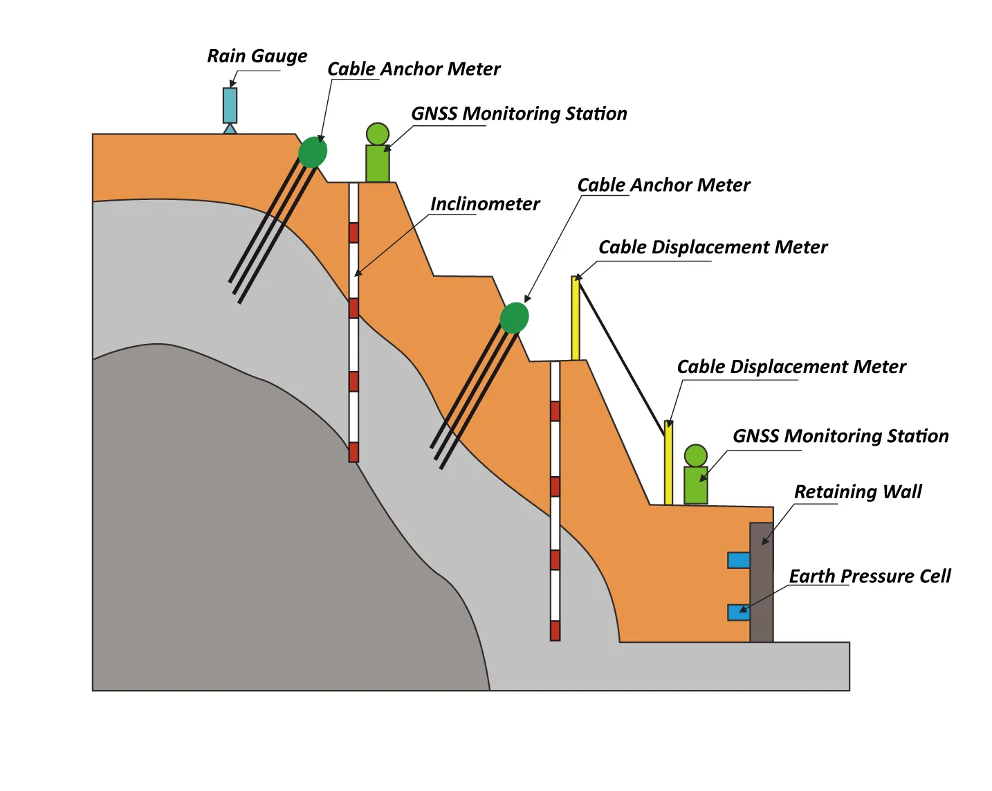 Monitoramento de deslocamento profundo, deslocamento de superfície, monitoramento de cabos de ancoragem, monitoramento de chuvas, monitoramento de nível de água subterrânea, alarme sonoro e visual, etc.