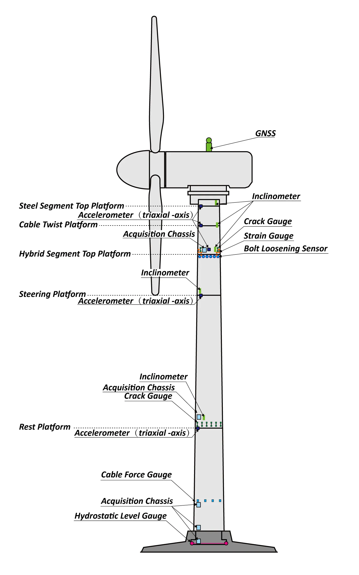 Ao instalar sensores relevantes em torres de turbinas eólicas para monitoramento de condições, os principais conteúdos de monitoramento para componentes estruturais de torres de turbinas eólicas devem incluir: monitoramento de vibração da torre, monitoramento de inclinação da torre, monitoramento de tensão da seção de transição superior, monitoramento de trincas no corpo da torre, monitoramento de deslocamento de torre, monitoramento de assentamento de fundação de torre, monitoramento de força de cabo, etc., de modo a atingir o objetivo de operação segura de torres de turbinas eólicas.
